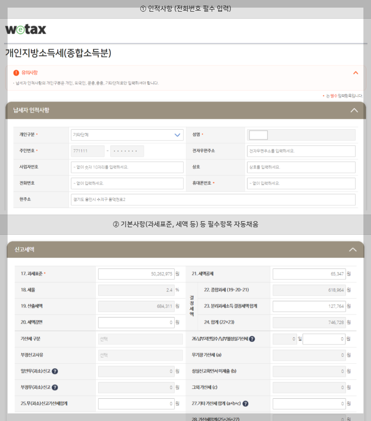 ③ 위택스로 자동 이동되어 인적사항 자동 입력